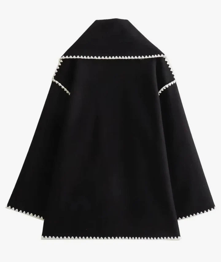 Ten elegancki płaszcz wyróżnia się prostą, naturalną linią i dopracowanymi detalami, które od razu dodają stylu każdej stylizacji. Luźniejszy fason miękko otula sylwetkę, nie krępując ruchów, a długość do bioder zapewnia wygodę na co dzień – podczas spaceru, drogi do pracy czy weekendowego wyjścia do miasta. Zintegrowany szal z frędzlami to nie tylko ozdoba, ale również praktyczne wykończenie, które przyjemnie ogrzewa szyję w chłodniejsze dni. Kontrastowe obszycia przy kieszeni i krawędziach dodają całości modowego charakteru, dzięki czemu płaszcz świetnie wygląda zarówno z prostymi spodniami, jak i ulubionymi jeansami czy swetrem o grubszym splocie.